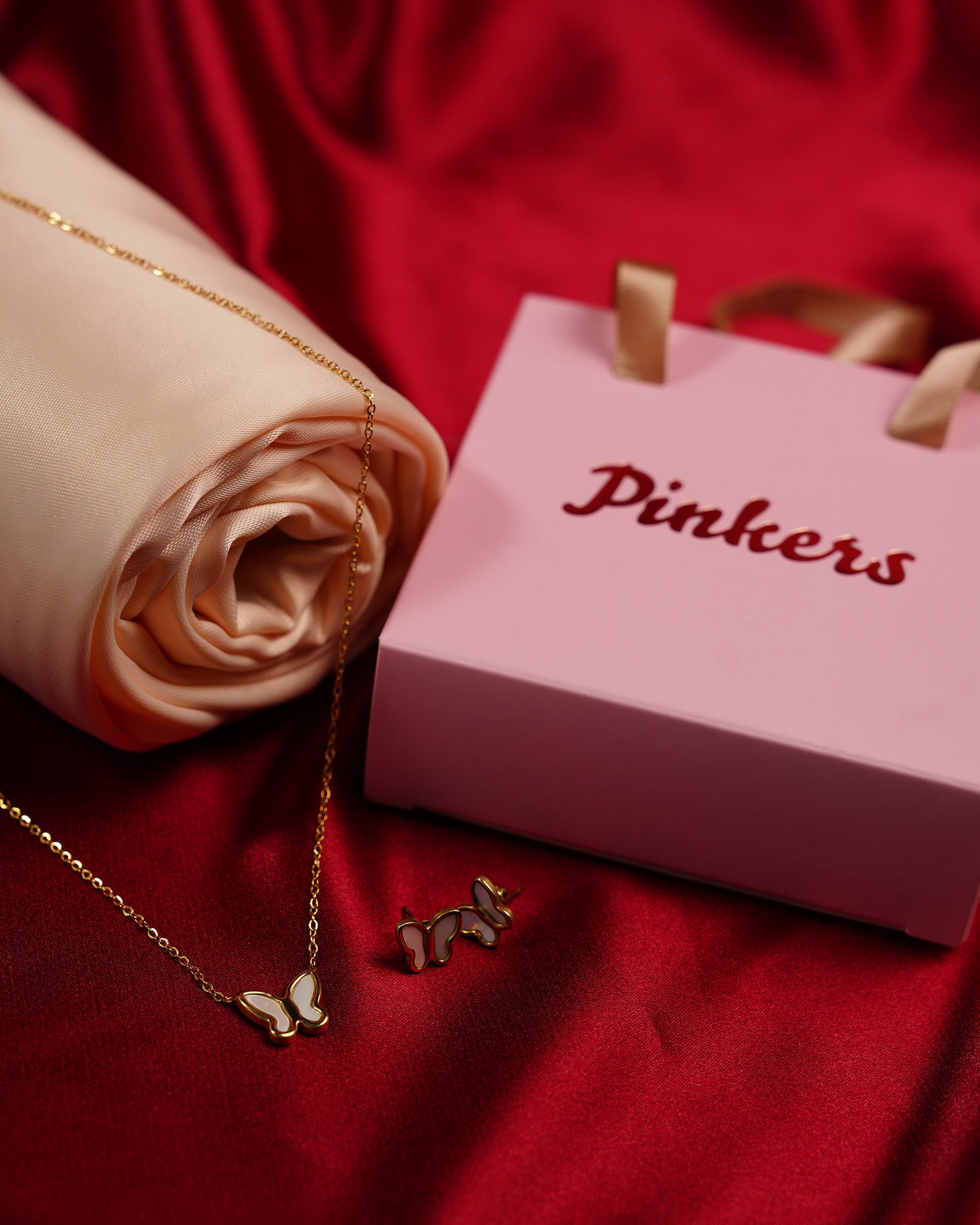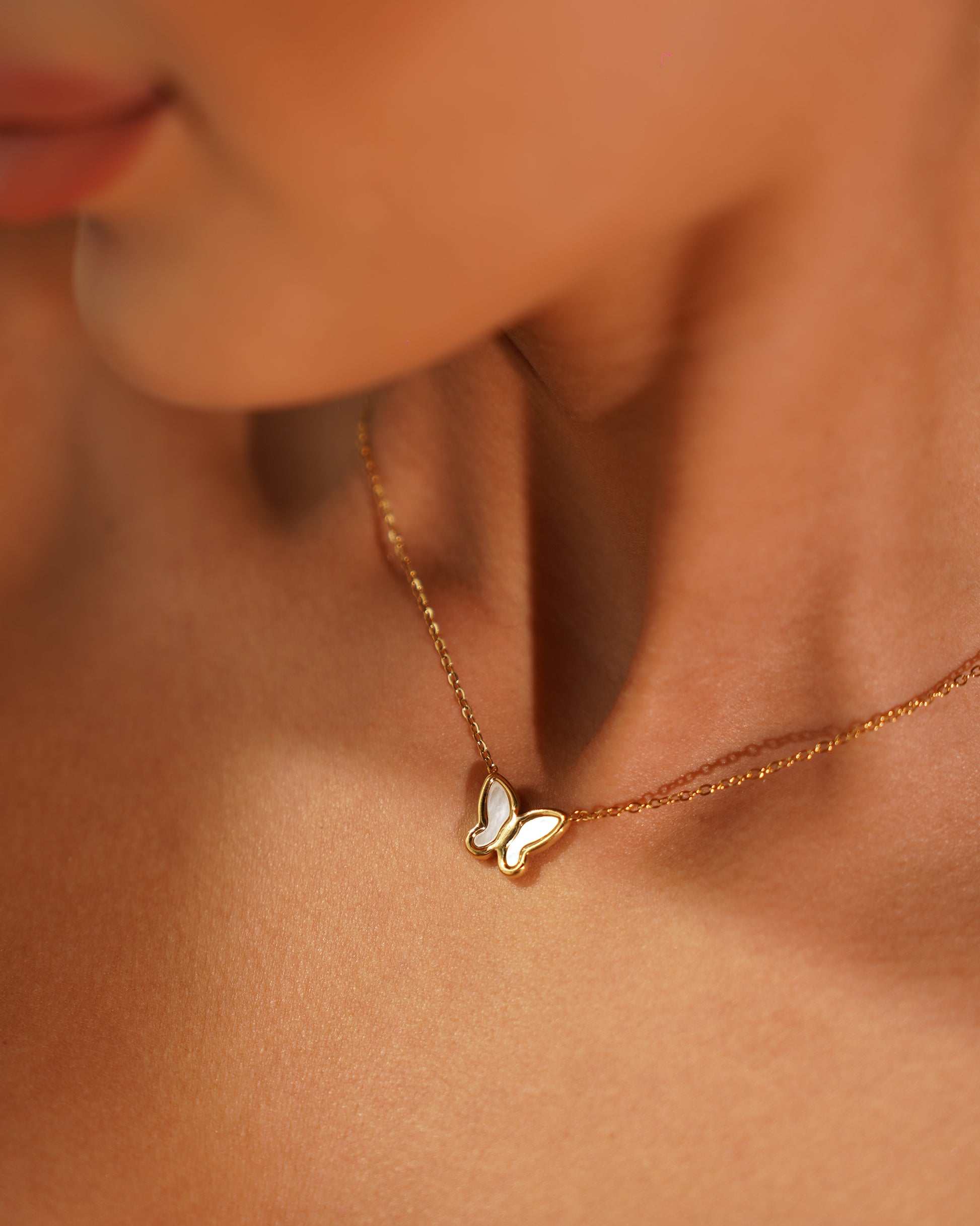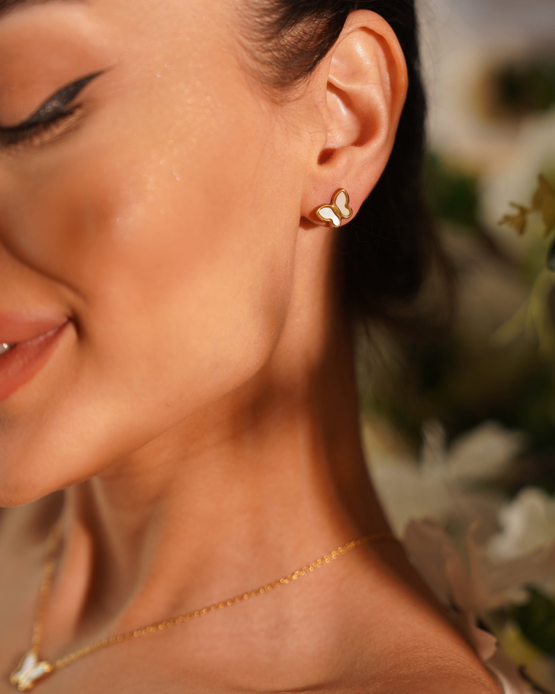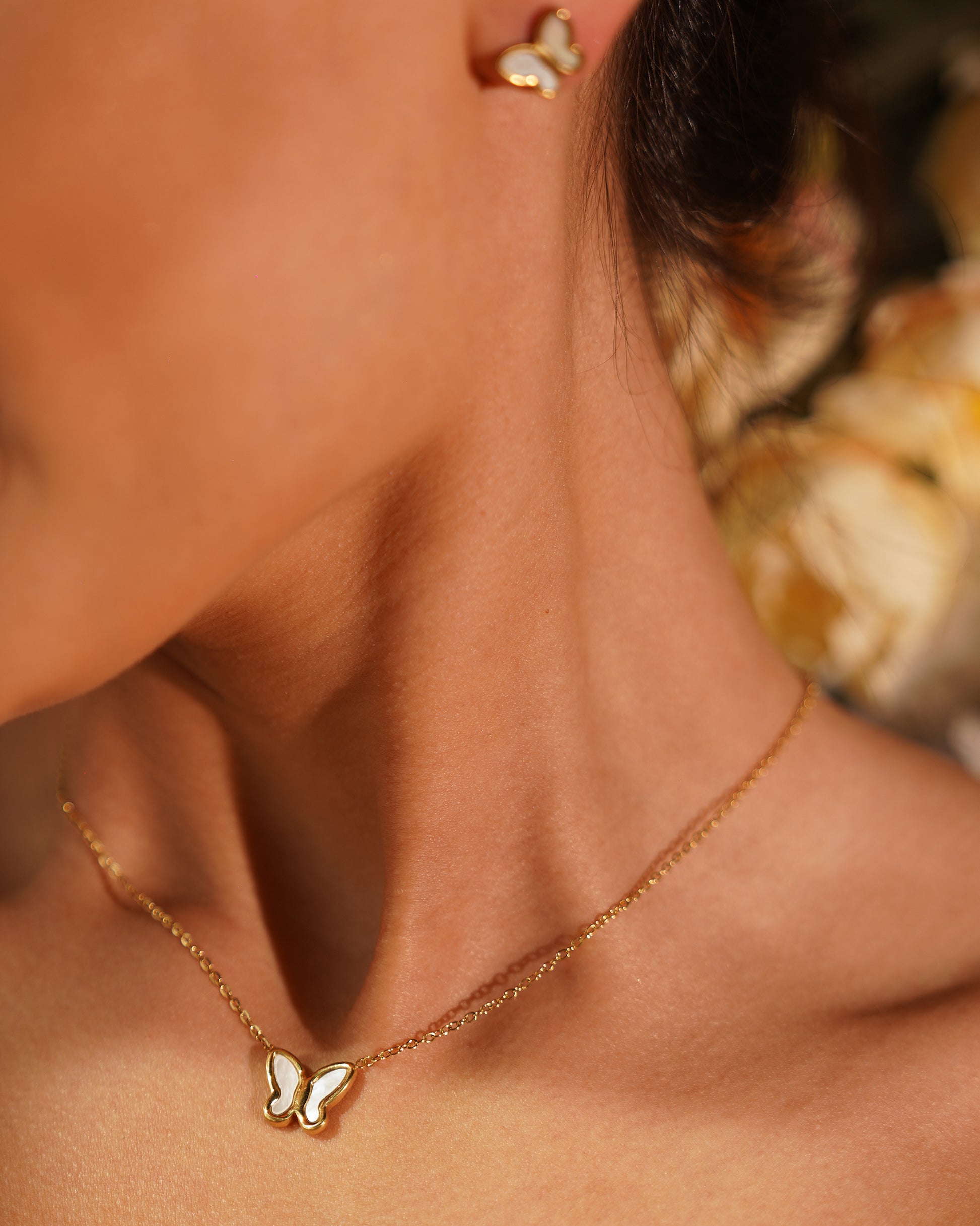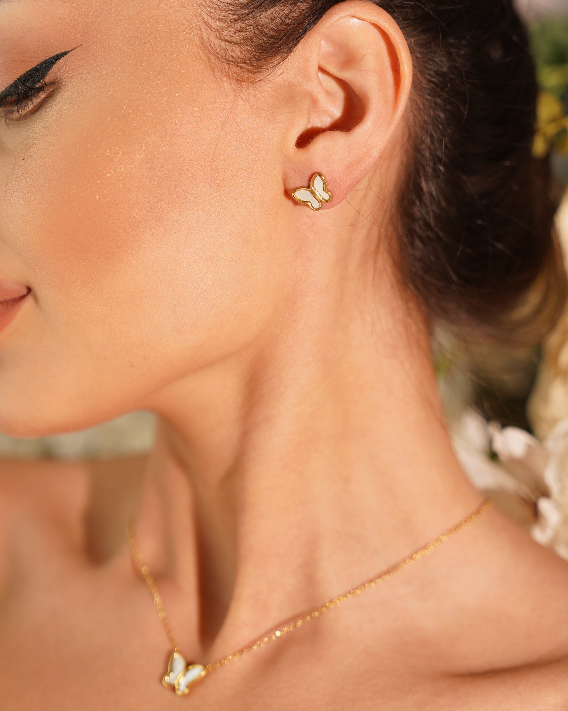 Delicate and full of charm, this 18k gold-plated jewelry set features graceful butterfly-shaped charms with glossy enamel accents.