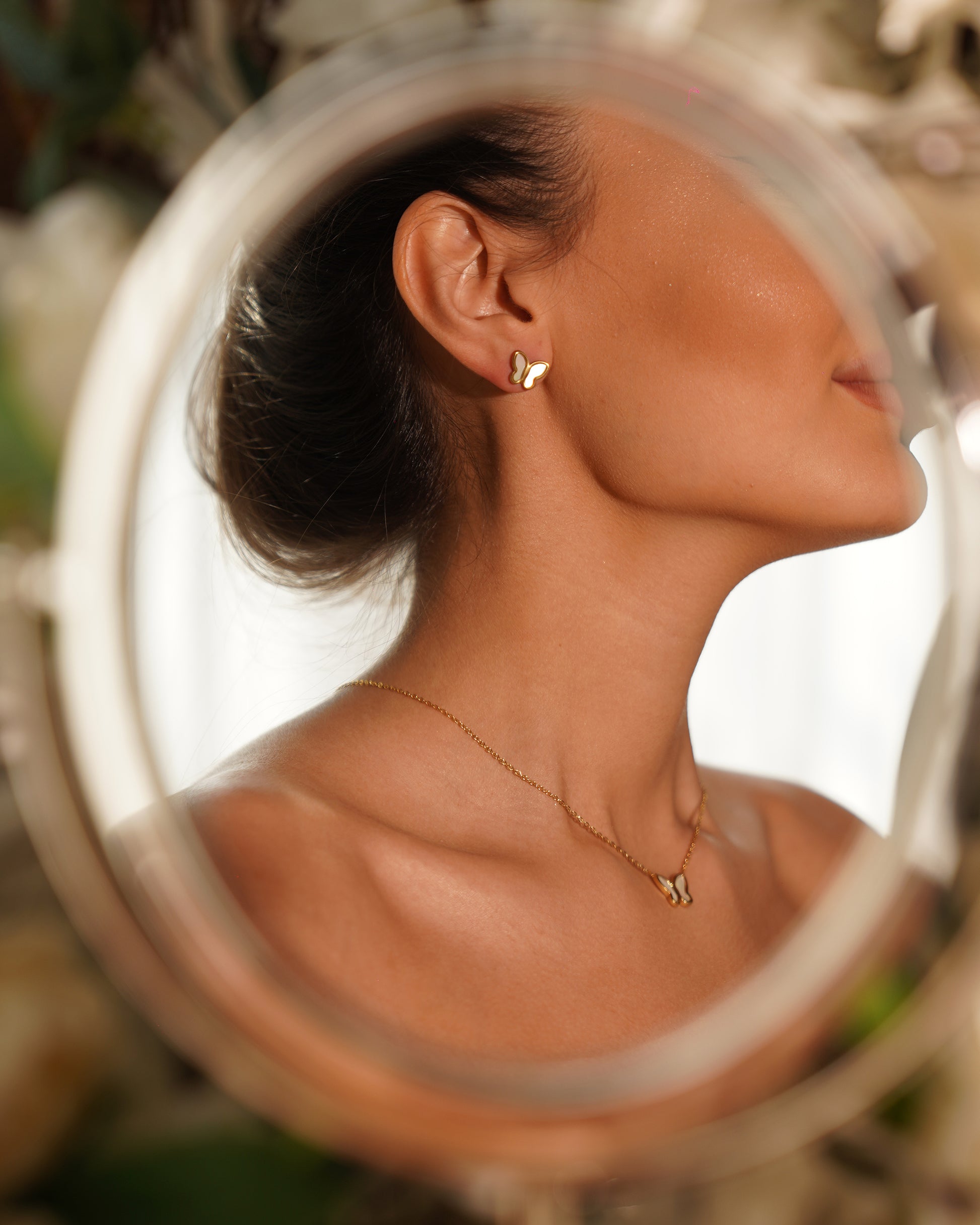 The necklace and earrings embody freedom, transformation, and feminine lightness — perfect for the woman who moves through life with gentle power.