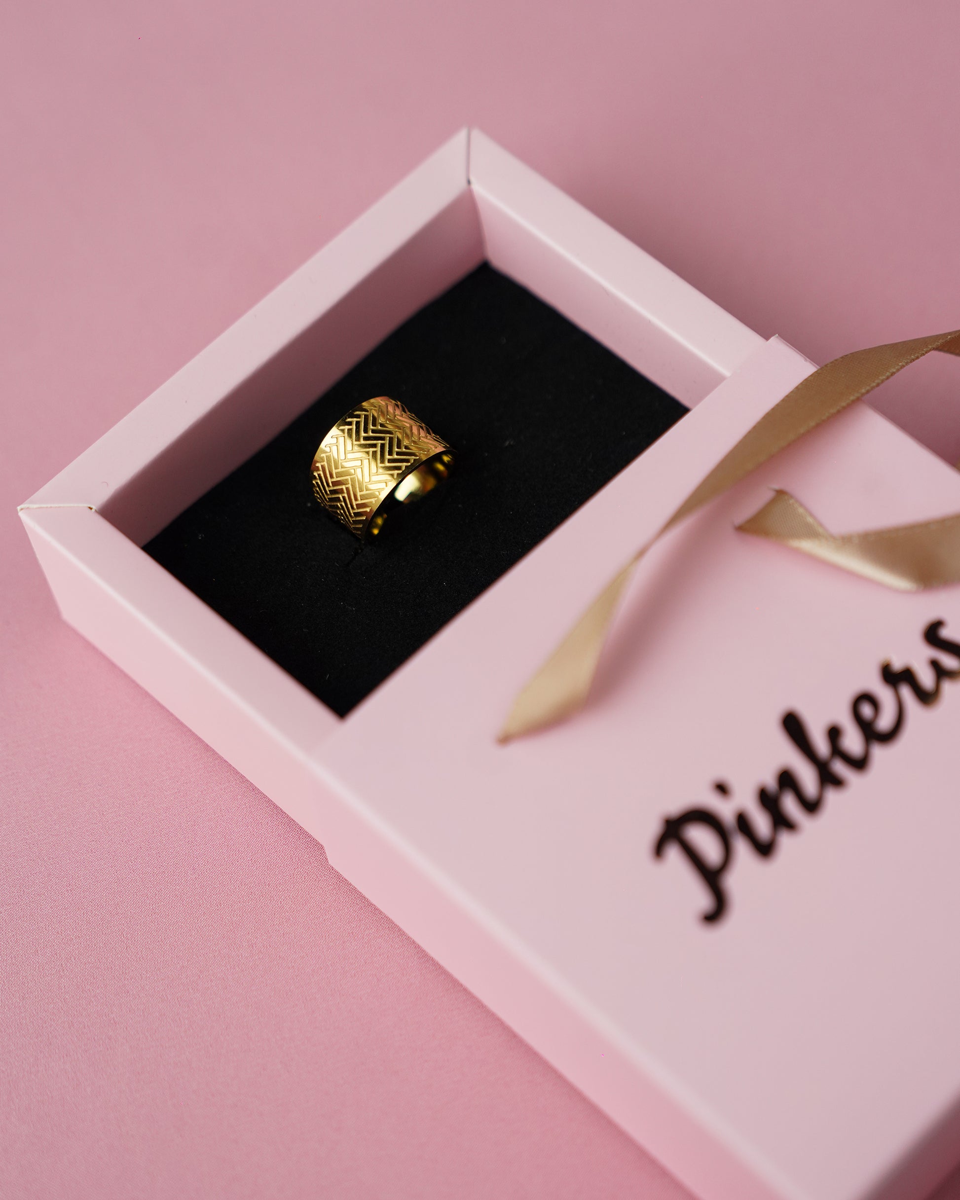 A ring that speaks without words — this wide 18k gold-plated band is etched with elegant waves and bold symmetry. It channels strength, stability, and refined taste. For the woman who leads with quiet confidence and effortless style.